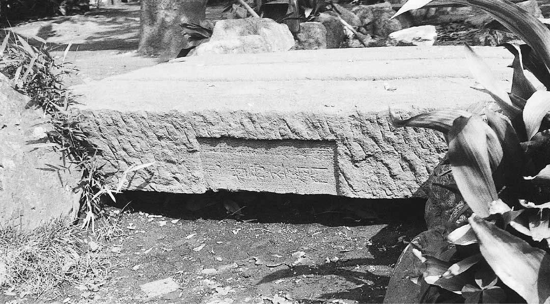 武蔵小杉駅前に保存されていた八百八橋の一つ。「上丸子村 野村文左衛門」と銘がある(昭和45年)