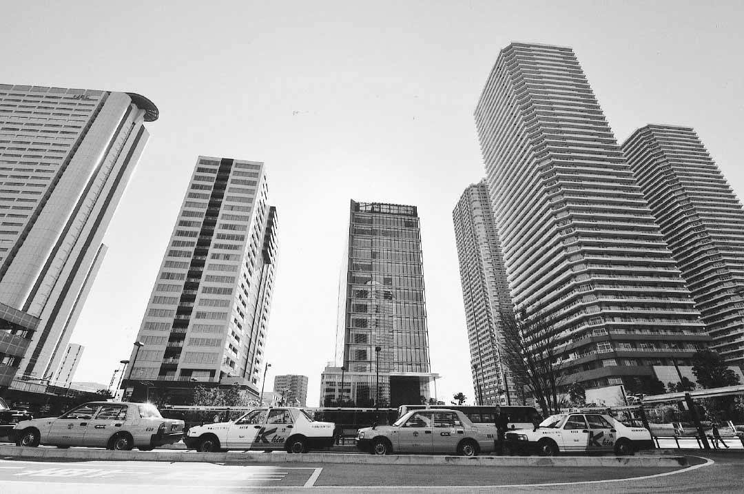 JR武蔵小杉駅新南改札(横須賀線口)駅前ターミナル。高層ビル群とタクシー(平成23年)