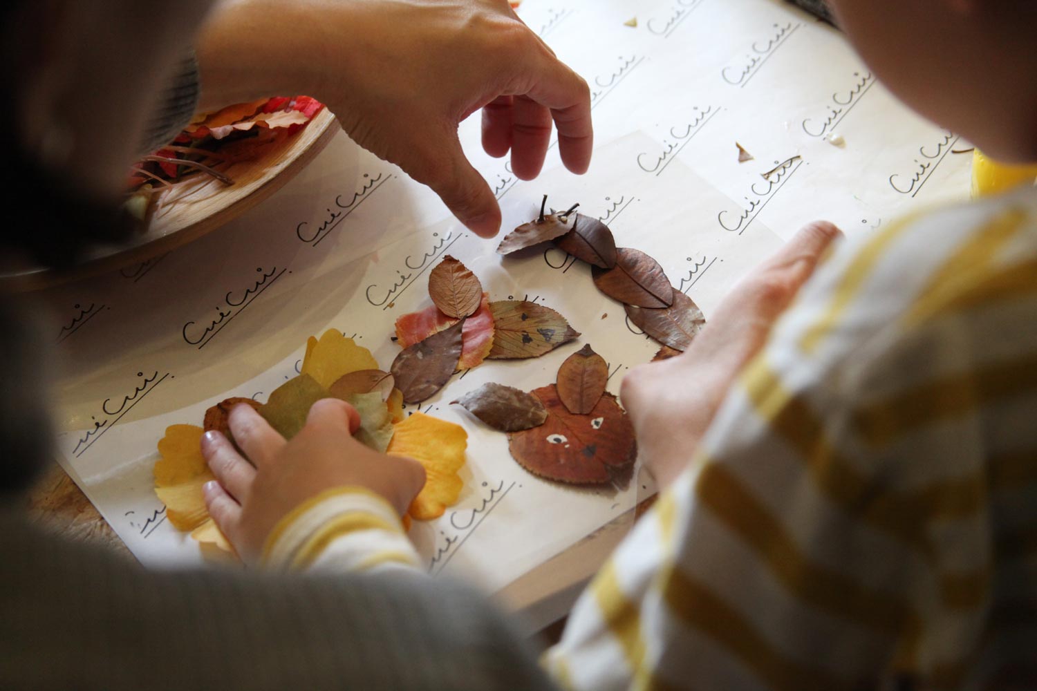 まずは、本物の落ち葉や落ち葉モチーフの素材を組み合わせ、葉のかたちの特徴を生かしながら、動物などの好きな形を作っていきます。先生が動物らしく見えるコツや組み合わせのポイントを、ひとりひとりにアドバイスします。